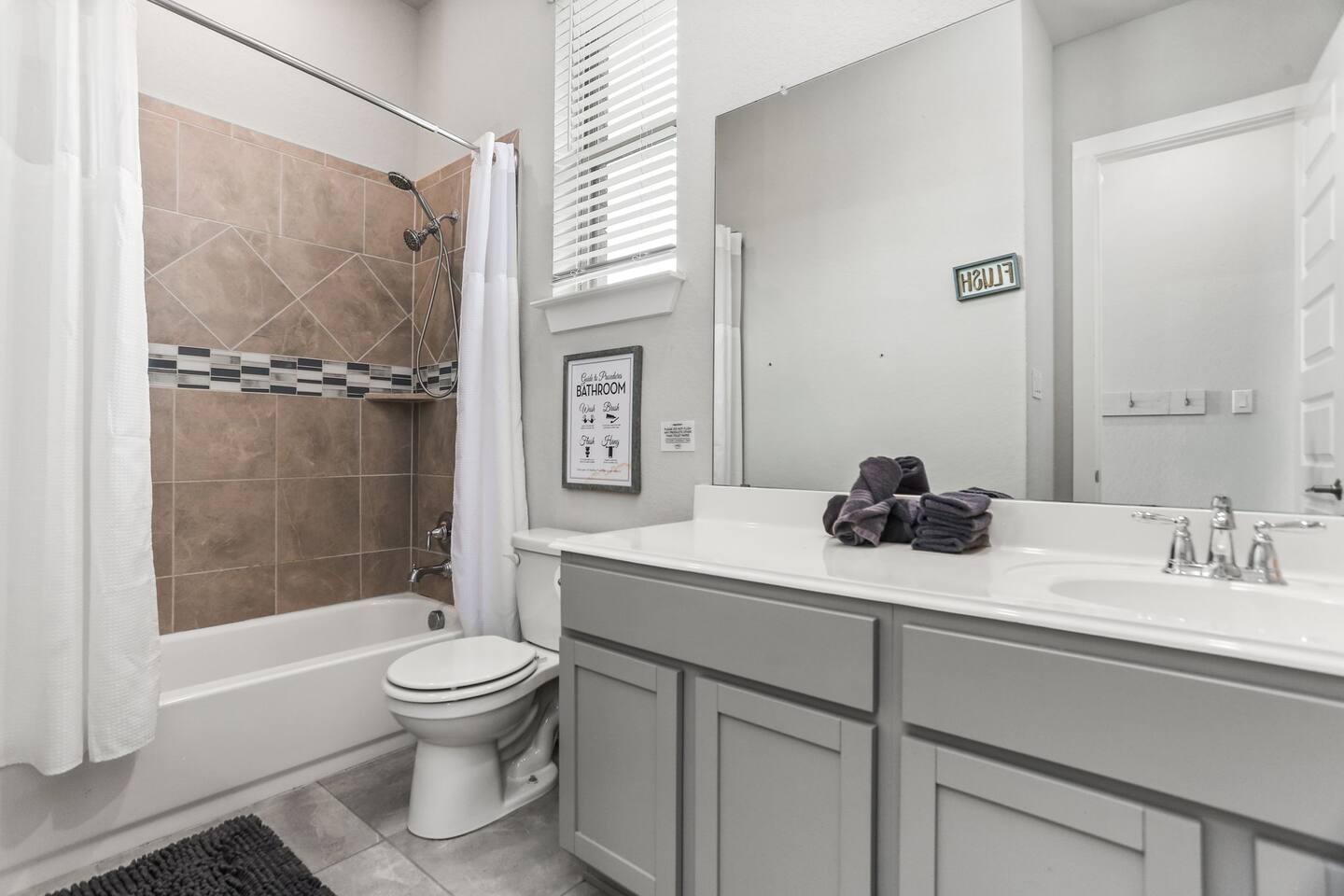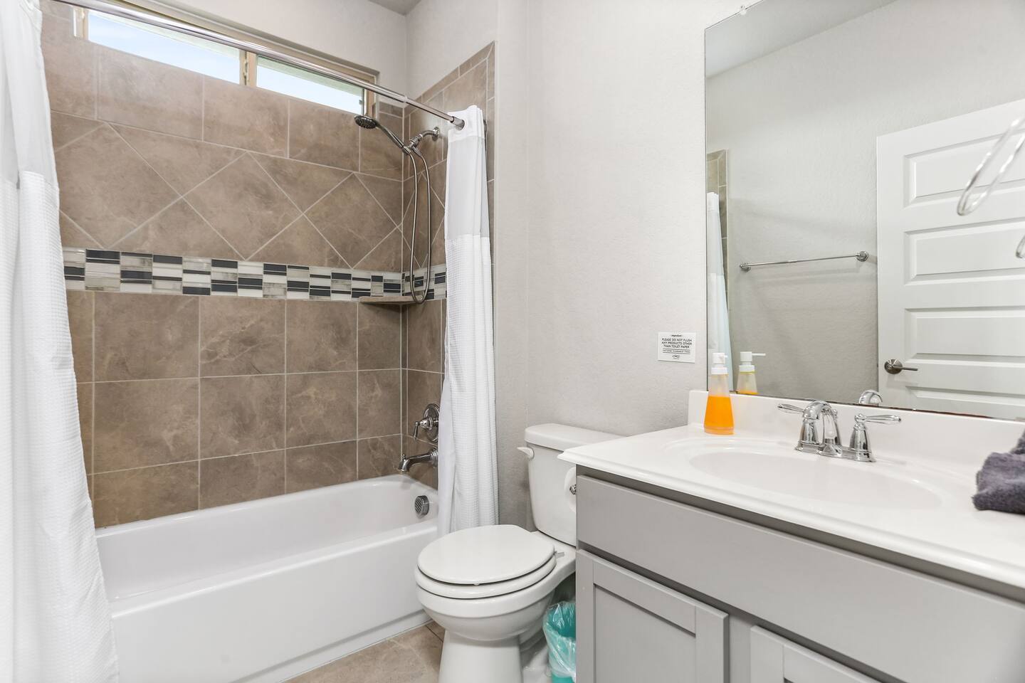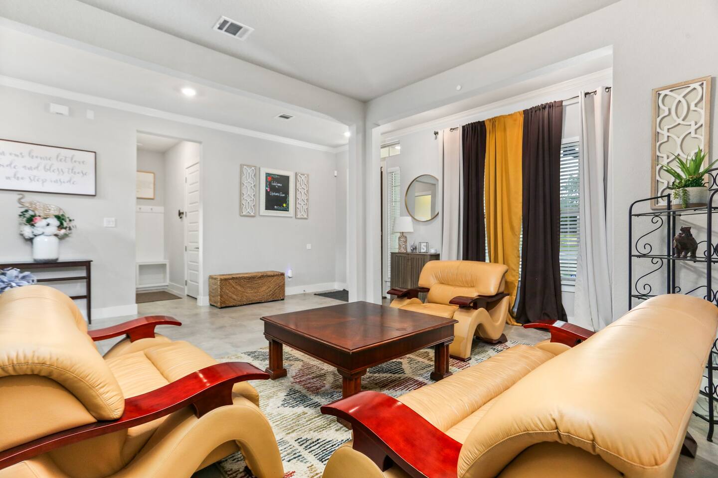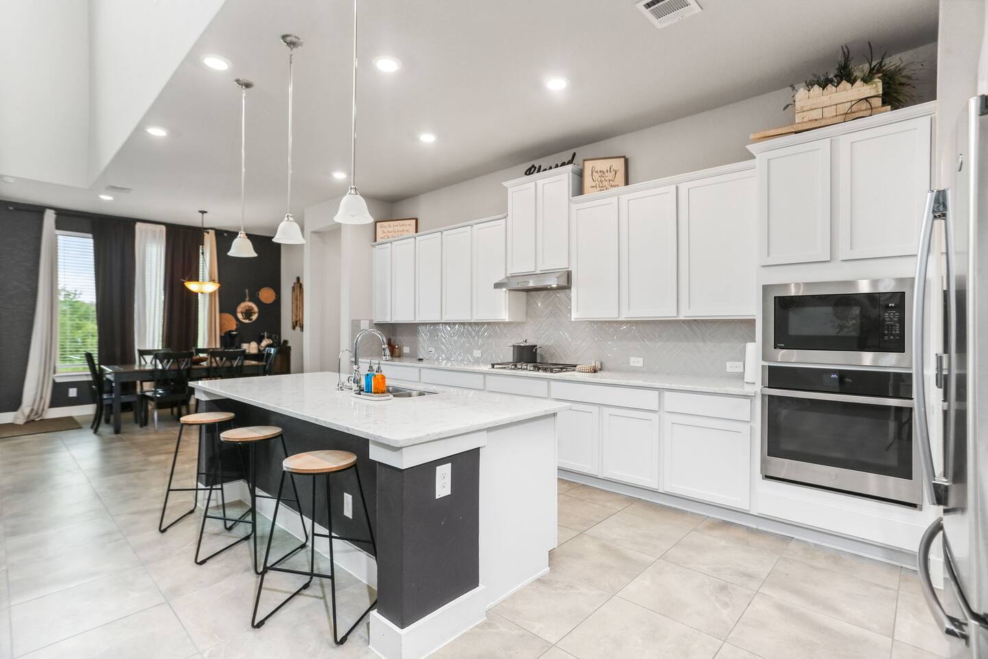 - Sleeps up to 15 guests comfortably - 2 KING beds + ample sleeping space for large groups - Movie room for cozy nights in - Game room with foosball & game console - Dedicated office space for remote work - Pack 'n Play + high chair for families with little ones - Fully equipped chef’s kitchen for home-cooked - meals - Professionally cleaned & sanitized - Self Check-In - Washer/dryer in-unit Plus, it's: - Just 4 miles from SeaWorld San Antonio and Aquatica San Antonio - A 25-minute car ride to downtown San Antonio - Get to Lackland Air Force Base in 20 minutes by car - THREE living spaces with cozy seating, plus a game room and movie room - More than 3,000 sq feet of thoughtfully designed space Plus, this home is: 4 miles (8 min) from SeaWorld San Antonio 13 miles (20 min) from San Antonio Aquarium 13 miles (20 min) from Lackland Air Force Base 13 miles (15 min) from the Shops at La Cantera 15 miles (18 min) from Six Flags Fiesta Texas 22 miles (25 min) from downtown San Antonio 22 miles (25 min) from the Alamo 22 miles (25 min) from the San Antonio River Walk 25 miles (30 min) from San Antonio Zoo 25 miles (30 min) from the Doseum 25 miles (30 min) from Witte Museum Close to restaurants and grocery stores -- BEDROOMS -- This more than 3,000 sq foot home has five spacious bedrooms. There are 4 bedrooms and two living areas located on the main level of the house. The master bedroom features a king-size bed, and a Smart TV to watch your favorite shows. It also includes an ensuite bathroom plus a large walk-in closet. The second bedroom is outfitted with a king-size bed, en suite bathroom and closet. The third bedroom features a twin over full bunk bed and the fourth bedroom includes a full over full bunk bed. The fifth bedroom is located on the second level and features a queen-size bed. The game room also has a futon that can be used as an additional sleep space. If you’re traveling with little ones feel free to use the pack n’ play and high chair! -- BATHROOMS -- -- BATHROOMS -- There are four FULL bathrooms. The first one is attached to the primary bedroom. The second bathroom is attached to the second bedroom. The third full bathroom is located in the hallway with the bunk rooms. The fourth full bathroom is located on the second level. There is also a half bathroom on the first level. All bathrooms include towels and essential toiletries (body wash, shampoo, conditioner). -- KITCHEN -- The heart of the home is this spacious, open-concept kitchen—perfect for gathering, cooking, and making memories. Featuring modern appliances, plenty of counter space, and a dedicated coffee bar, it’s fully stocked for all your cooking needs. The bar seating for 3 makes it easy to chat with the cook or enjoy a quick bite, while the dining table seats 6 comfortably for family meals or game nights. Additional seating in the adjacent living room keeps everyone connected, whether you're sipping coffee, sharing meals, or just relaxing together. -- LIVING ROOM -- There are four living spaces in the house. The main level living room is located next to the kitchen and is a great space for chatting while whipping up culinary delights. You will see the second living space as soon as you enter the home. The third and fourth living spaces are on the second level. One has been turned into a game room with a foosball table, game console and futon. The other is a movie room with comfy seating and a big screen TV. -- OUTDOOR AREA -- Take in the beautiful Texas sunrise or sunset on the back porch during your stay. There is outdoor seating so you can bring your favorite drink and just enjoy the peace and quiet. -- Book Today & Enjoy the Best of San Antonio! -- To abide by all legal requirements and property rules, you WILL be asked to provide a copy of your official government-issued photo ID, confirm your contact information, pass through our verification portal and, in some instances, complete a criminal background check. Failure to provide these documents will result in a cancellation and denied entry. IMPORTANT NOTE: The information is collected for verification only and is not stored or used for any other purposes.
