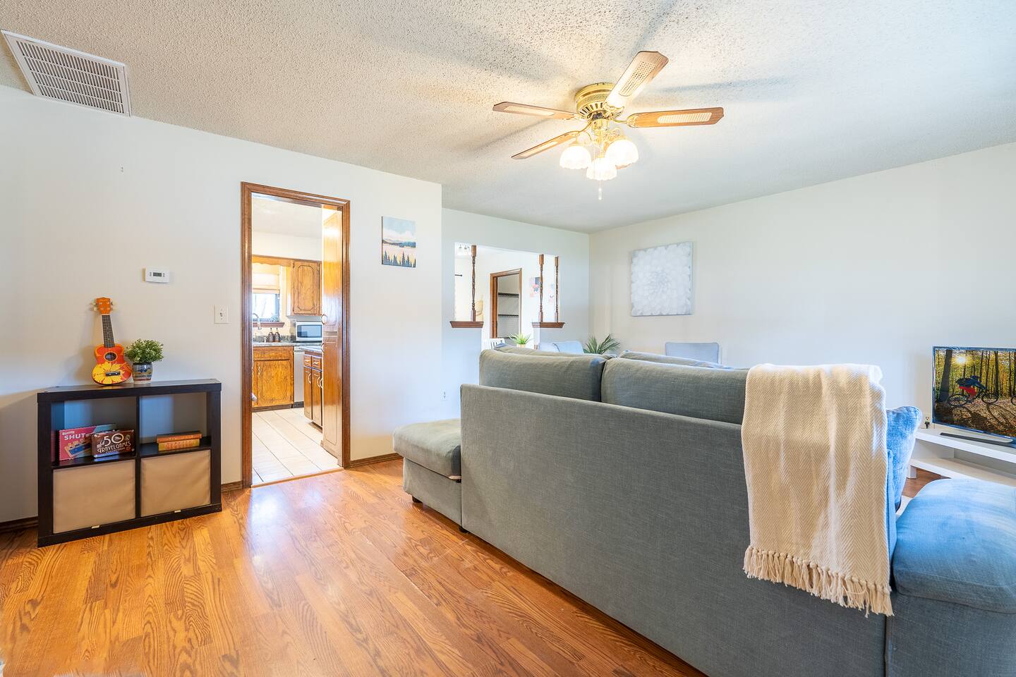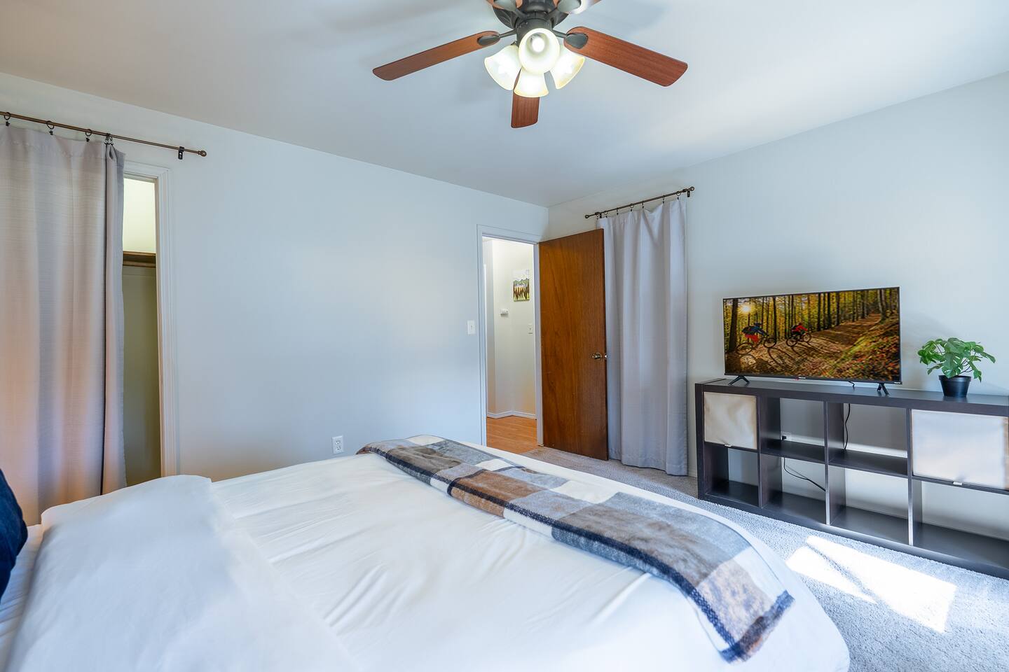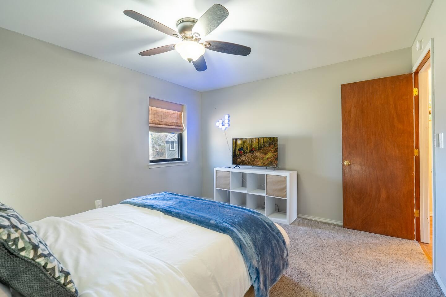 - 2 bedrooms plus queen-size pull-out sofa bed, home sleeps 6 total - Prime bikeable location - Walk to the new Walmart campus: perfect for corporate travelers - Close to downtown Bentonville, Crystal Bridges Museum, and top-rated restaurants - Steps from scenic bike trails, shopping, and coffee shops For Mountain Bikers: - Bike everywhere - Bike rack provided - 13-minute bike ride to Slaughter Pen Trailhead - 17-minute bike ride to Park Springs Trailhead - 20-minute bike ride to Coler Mountain Bike Preserve Plus, this home is: 1.6 mile (5 min) from The Momentary 2.2 mile (6 min) from Scott Family Amazeum 2.2 mile (6 min) from Crystal Bridges Museum of American Art 2.3 miles (7 min) from Walmart Home Office 2.4 mile (7 min) from Downtown Bentonville 14 miles (24 min) from Northwest Arkansas National Airport Less than a mile from various restaurants -- BEDROOMS -- This cozy, minimalist retreat near downtown Bentonville has two bedrooms. The first bedroom has a queen-size bed and two closet spaces. The second bedroom also has a queen-size bed plus closet. Both bedrooms have TVs. -- BATHROOMS -- There is one full bathroom. It features a vanity and shower/tub combo. It includes towels and essential toiletries (body wash, shampoo, conditioner). -- KITCHEN -- The quaint kitchen is the perfect space to dine-in or enjoy some takeout. The dining table seats four, while the bar can seat up to three guests. From plates and glasses to pots and pans, the kitchen is equipped with all items you need to prepare meals. Step out on the back porch to enjoy your favorite drink. Complimentary coffee and tea provided. -- LIVING ROOM -- When you enter the home, you will immediately see the living room in front of you. It is an open concept with a sectional sofa and two chairs. The sectional turns into a queen-size sofa bed. Watch your favorite shows and movies on the TV. -- OUTDOOR AREA -- There is a back porch where you enjoy the outdoors. Additionally, there is a grill on the porch for guest use. The sides of the backyard are fenced-in, however the back of the home has an open area that connects to a walking trail. -- Book Today & Enjoy the Best of Bentonville! -- To abide by all legal requirements and property rules, you WILL be asked to provide a copy of your official government-issued photo ID, confirm your contact information, pass through our verification portal and, in some instances, complete a criminal background check. Failure to provide these documents will result in a cancellation and denied entry. IMPORTANT NOTE: The information is collected for verification only and is not stored or used for any other purposes.