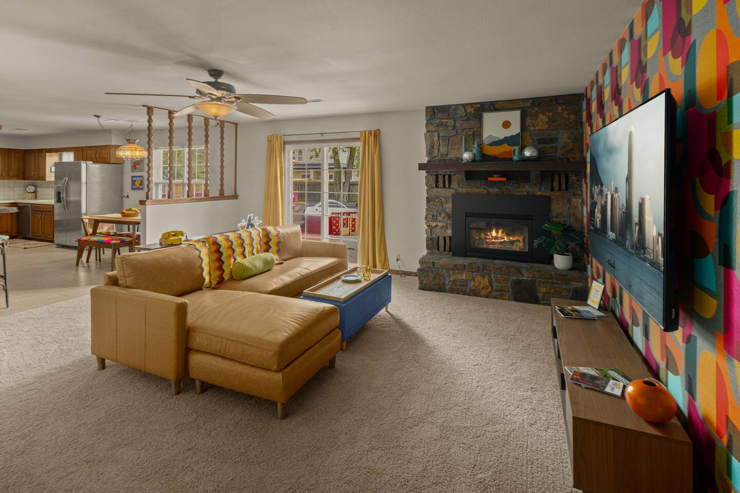 Step back in time with this spacious 4-bedroom, 2-bath 1970s-themed home in the heart of Bentonville! Perfect for families, work groups, or anyone visiting Northwest Arkansas. - Just a 4-min drive or 6-min bike ride to the New Walmart Home Office Campus. - Just a 5-min drive or a 10-min bike ride to downtown Bentonville - Dog friendly! - Family friendly and bike friendly - walk/bike everywhere - Professionally cleaned & sanitized - Self Check-In - Fully equipped kitchen - Washer/dryer in-unit